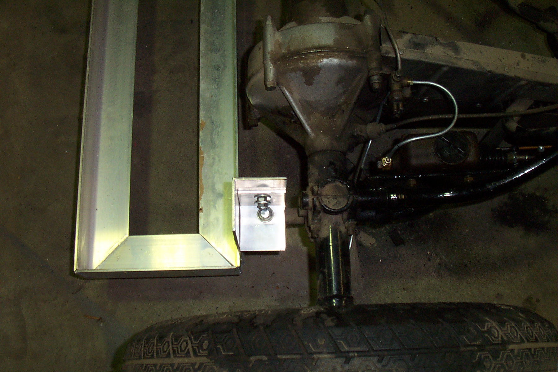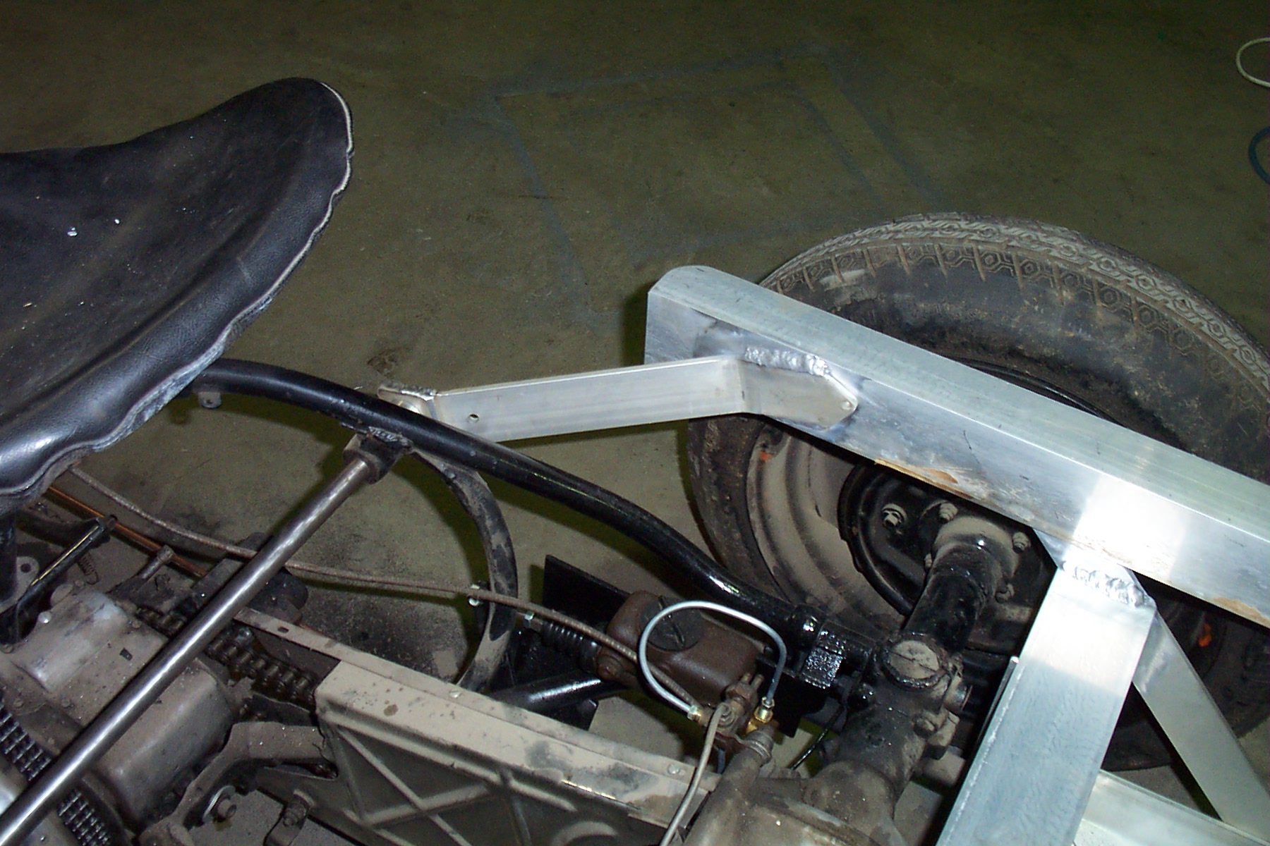 Next I moved on to the battery rack. I am still unsure of how many batteries I will end up with. The first few will go in a rack behind the axel. This will leave room for more possible in the box over the axel as well as one or two up front where the fuel tanks would normally be. Above is the basic framework sized such that I can put 4 batteries side by side. I sized the frame for Trojan T125 6 volt batteries and mounted it low enough that the batteries will be below the floor of the back box. I needed to create some way to support the back box over the batteries and added the framework shown below. The flat bars at an angle are to hold up the back side of the batteries. This entire structure is attached directly to the frame at two points and would not be able to support the battery weight or even the box weight during movement. The original mounting for the box was to a cross shaft up front with springs and shocks under it. I re-created the front mount for the aluminum frame to give it the required strength. Here is the rear and front mounting for the framework. There is still some concern that I may be making a "wheelie" machine, however I think with my weight and any additional batteries mounting forward of the axel, I will be OK. Worst case I'll add wheelie bars at the back. The structure is fabricated out of 3"x3"x1/4" aluminum angle with the braces fabricated out of 1/"x2" aluminum flat bar. The front mounts are doubled up to be 1/2" thick where they are mounted on the 3/4" front mount shaft which is a piece of stainless steel that I had on hand.