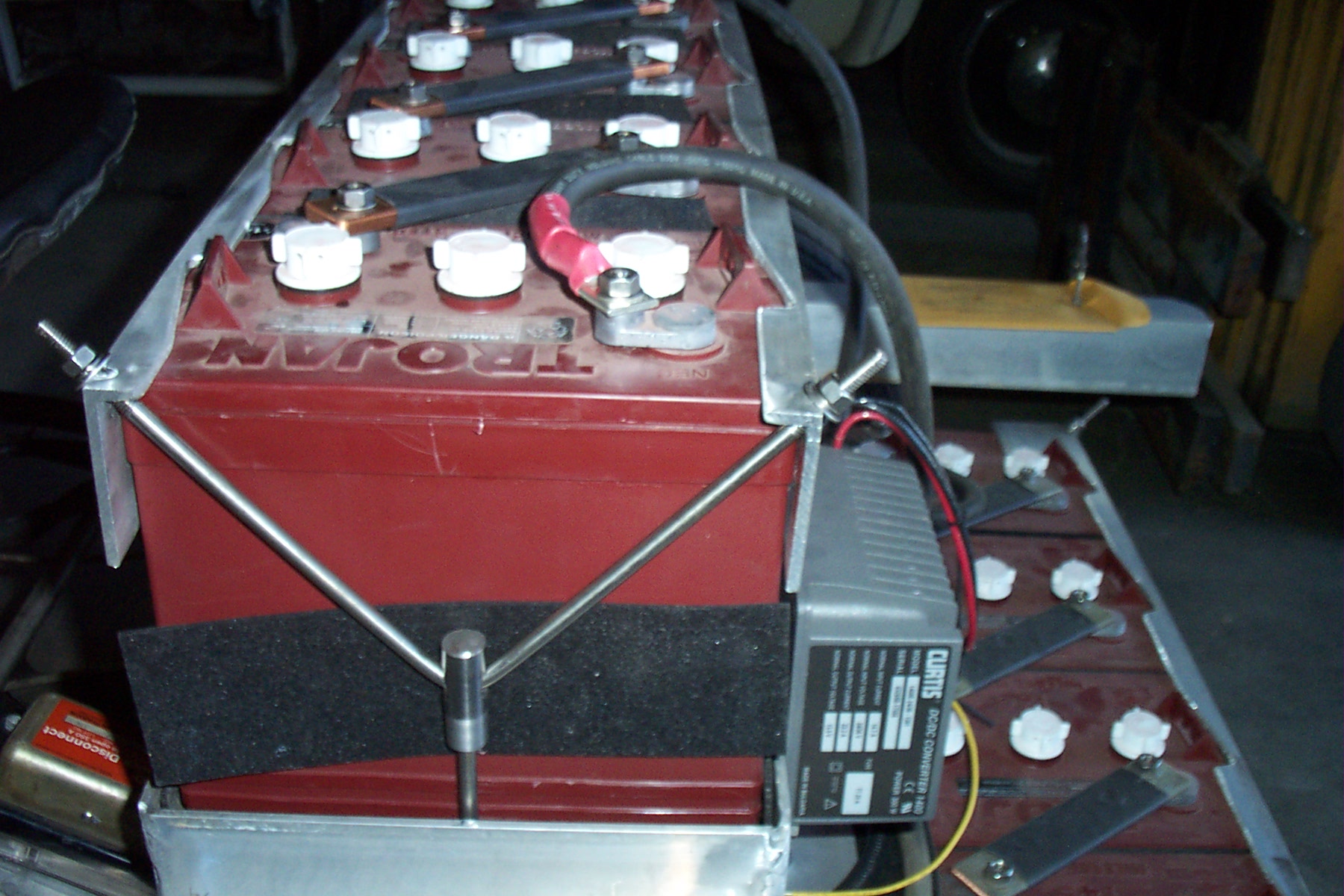 The batteries have now been mounted and tie downs are in place (May 06) Upper rack on the left and lower rack on the right. A rear view of the batteries in the racks, 24 volts in each rack. The lower rack has the additional load of the DC-DC converter as well as the 24 volt coil of the main power contactor. I have set up the system to be charged as 2 separate strings of 24 volts so the lower string can be kept up with the upper string. I am planning on using a Curtis Battery Fuel Gauge on the lower string as it will be drawn down faster and I will need to tailor my driving to it's capacity. The motor will be run on 48 volts.