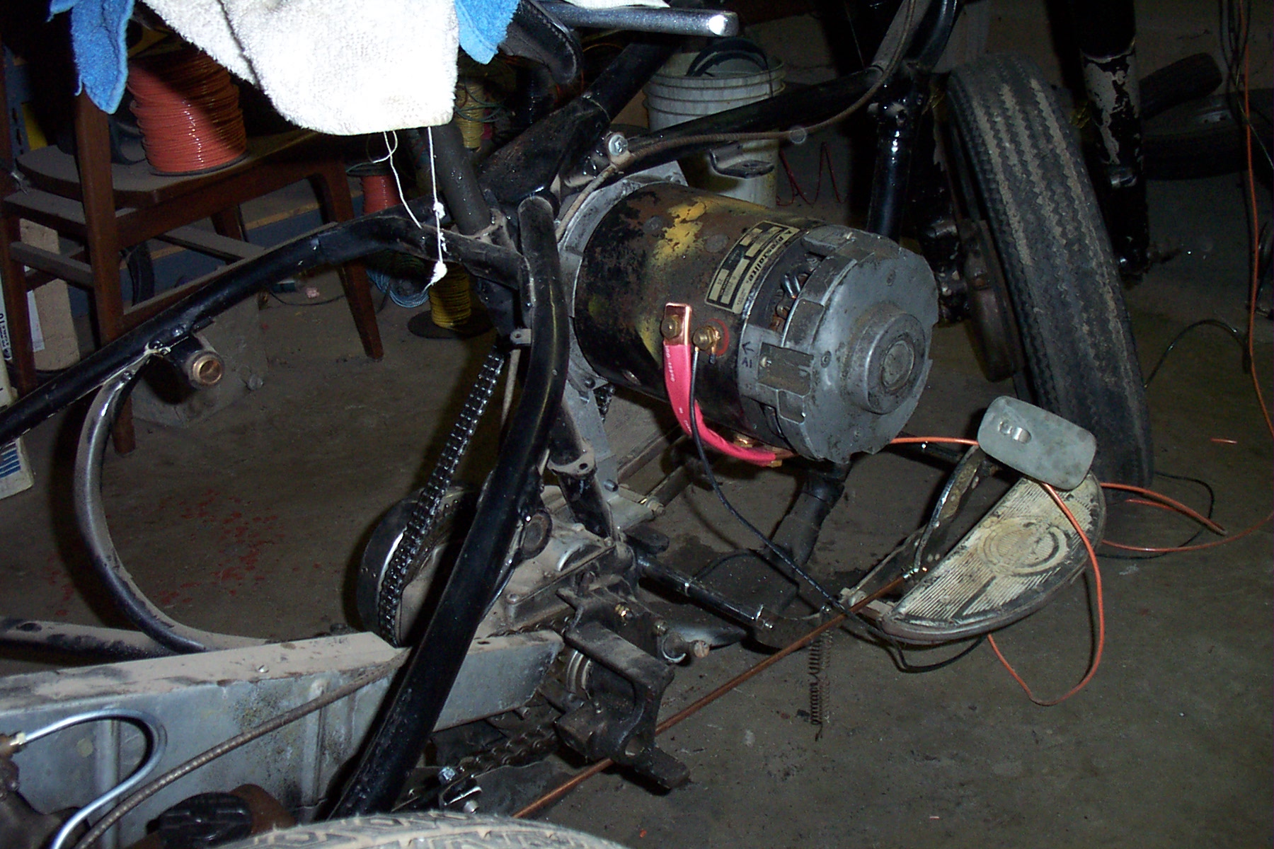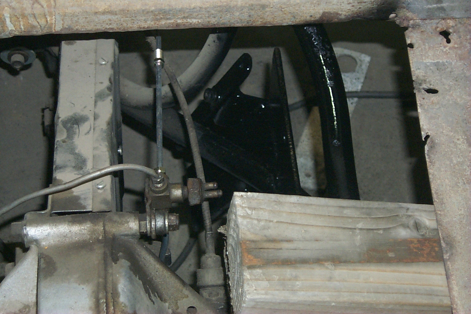 The linkage from the master cylinder was also needed and I was able to fabricate one out of 1/4" welding rod as seen in the next photo connecting the brake pedal to the master cylinder operating lever. The end fittings were ordered from McMaster Carr Company. The wheel cylinder on the right rear wheel was in need of a kit or replacement and amazingly enough the local auto parts store had both options available from the casting number on the cylinder. I went with the kit and may end up putting a kit in the master cylinder as well. The local Harley Davidson dealer is not at all interested in anything other than selling new bikes and accessories so I didn't even try there. I have tried other parts requests there and the stock answer is "obsolete, no longer available". |