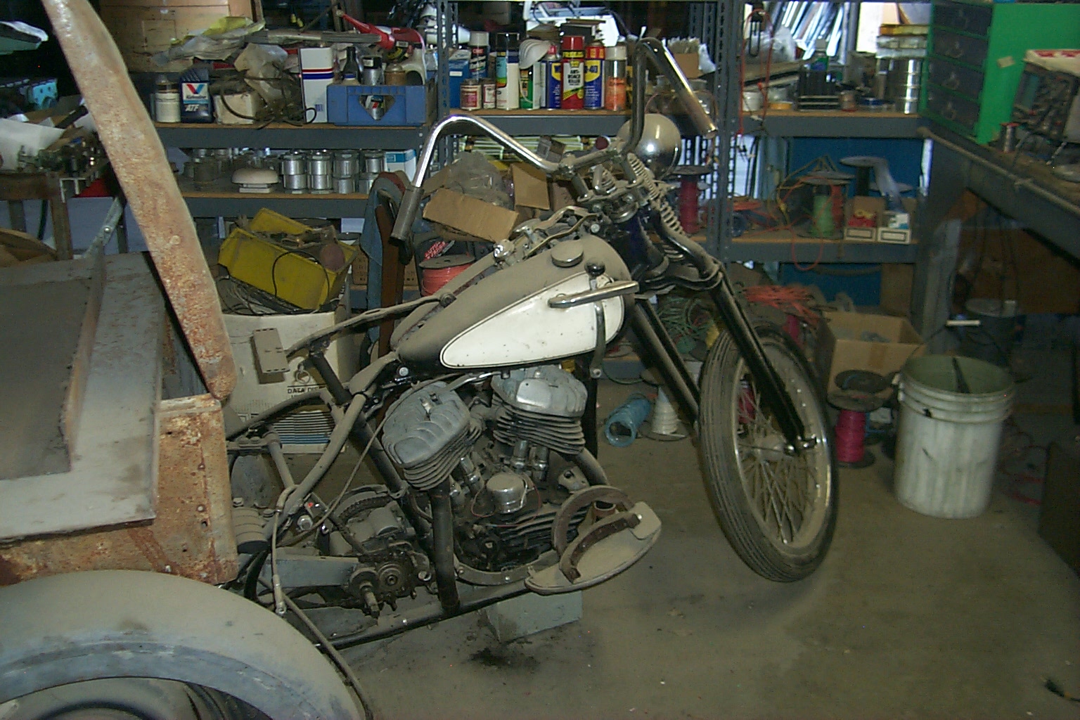 The first order of business was to un-pile the stack of parts that had accumulated on and around the Servi over the years. Originally I had planned to put it back together and had purchased some of the missing pieces. The front forks that came on it were 4 inch over springer type with a skinny front wheel and the original would have been a "Duo-Glide" style with a wider front wheel. I had purchased a "proper" front end for it from Ebay and so began to take the front end apart to make the swap. I wanted to get the bike back to as close to the original geometry as possible and also to let it have the "look and feel" of a 1958 HD Servi-car.