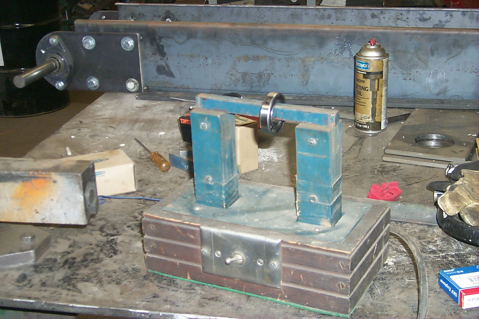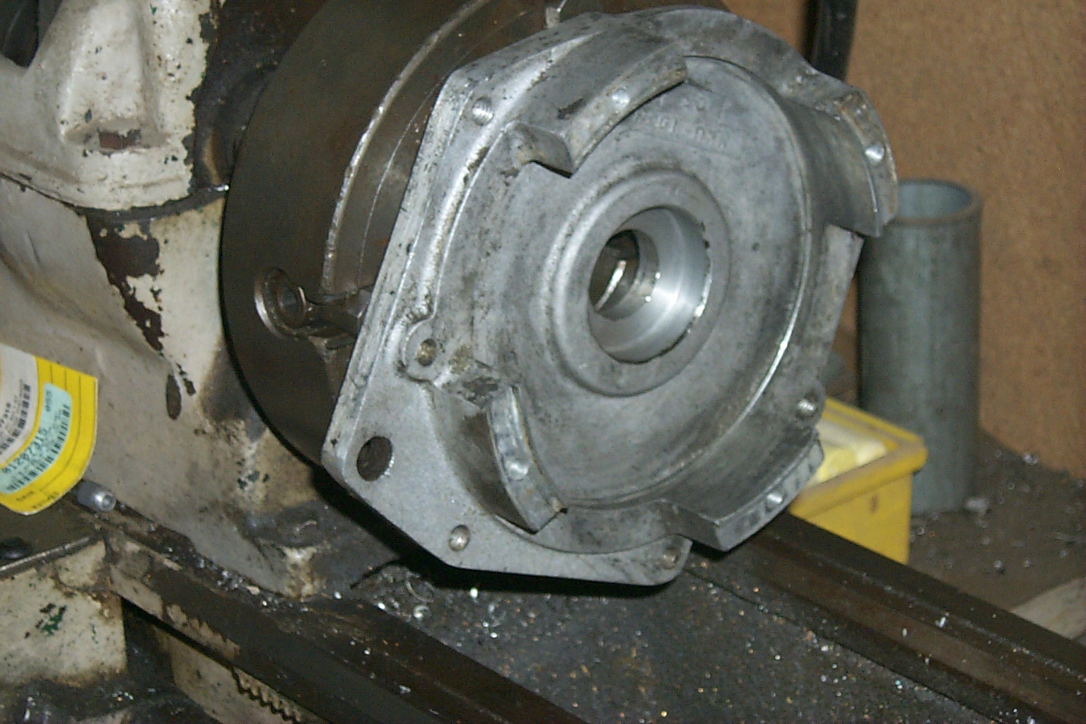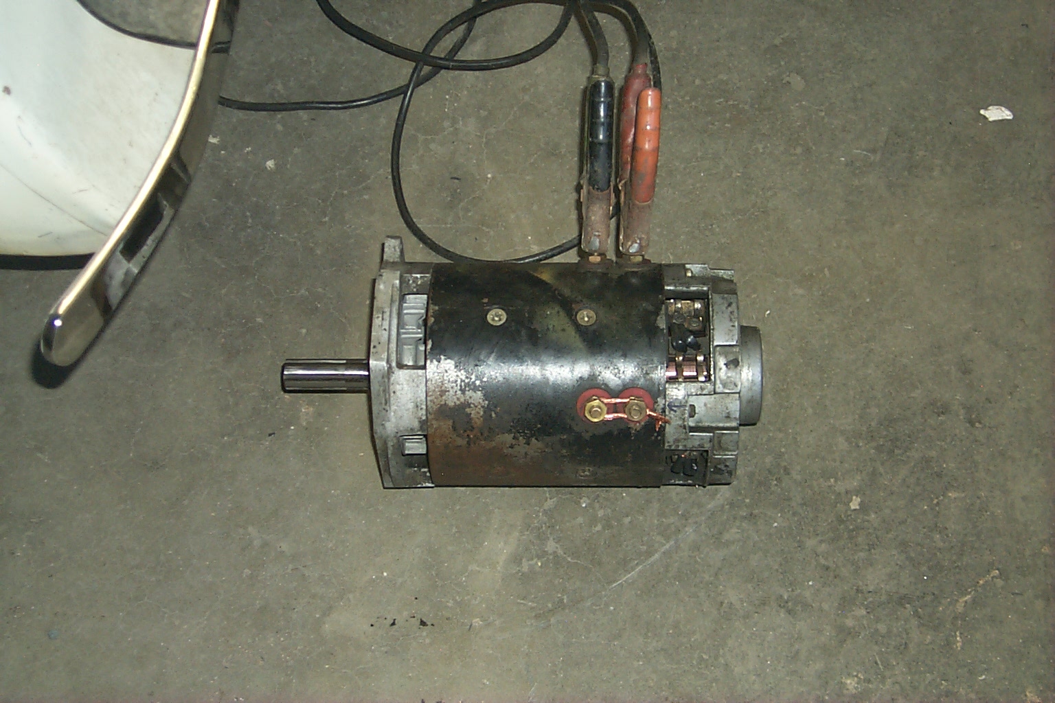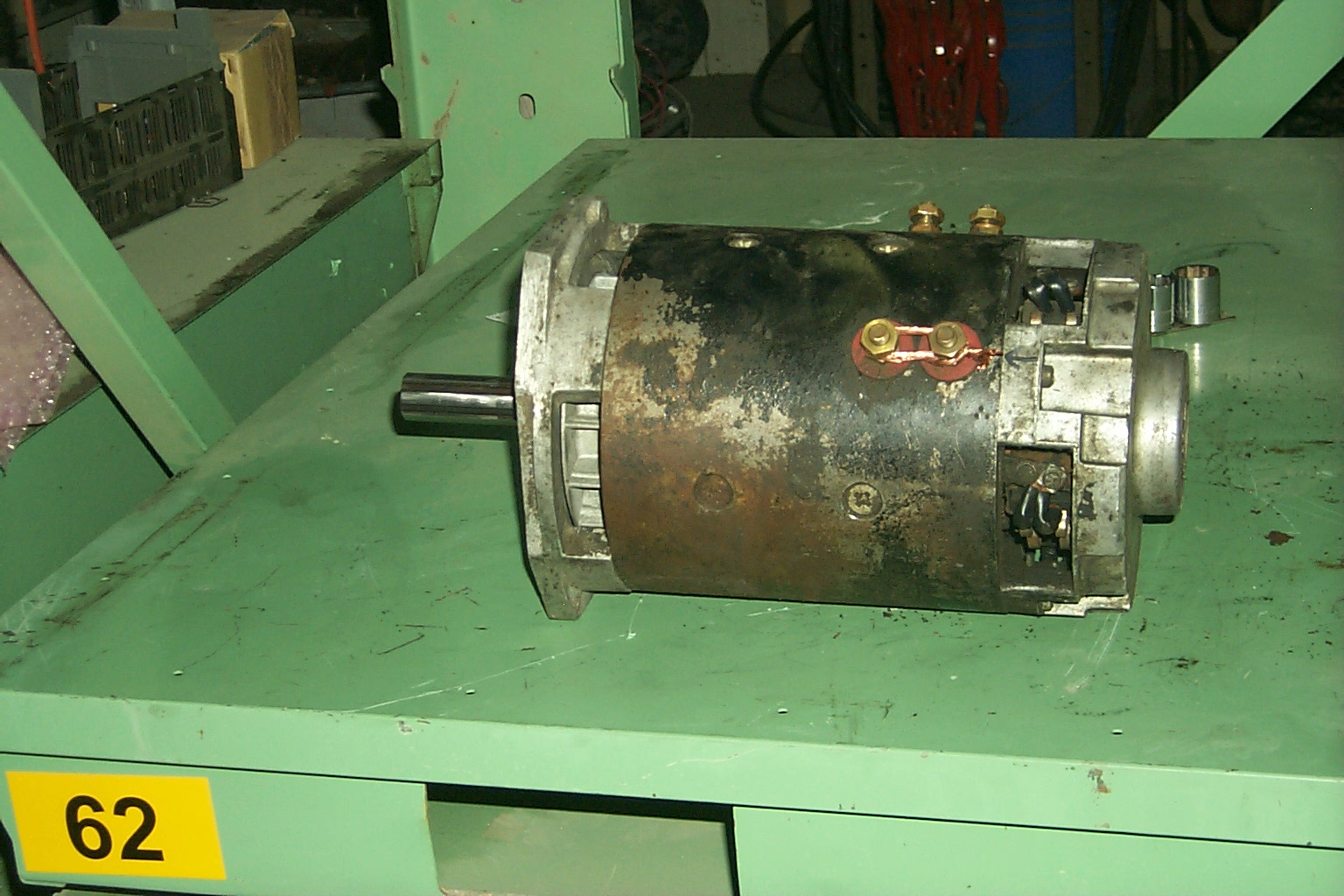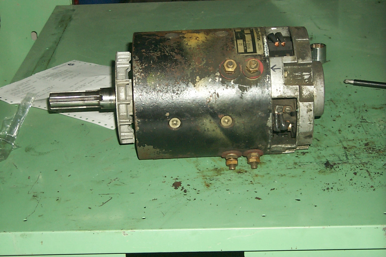 ![]() The motor as it has been modified. The motor from the Pallet picker was mounted directly to a gearbox for the main drive wheel. Unfortunately, the front bearing is actually in the gearbox and the front of the motor only contained an oil seal. A trip to the local bearing house, Applied Industrial, came up with a bearing that was close to the size of the shaft and only 3mm larger than the outside diameter of the oil seal. Another drawback of this motor is the splined shaft which I have yet to deal with, but I do have some ideas percolating on that. Next is the end bell for the motor installed in the lathe in preparation for making the bearing fit in place of the oil seal. As it turns out the housing was easily turned to fit the outside of the bearing. The shaft of the motor where the oil seal was riding measured 1.1895" which is actually 30.2133mm. Since the bearing was 55mm by 30mm this meant the shaft needed to be turned down to 1.1811". I stopped a little over at 1.1819 or .02mm for a slight interference fit or so I thought. Several years ago, I built a bearing warmer for a customer, so I went by their facility to try to install the bearing with it. For those who don't know, one way to get a bearing on a shaft is to heat the bearing to approx 200 degrees F and then slip it on the shaft. As the bearing warms it actually expands and will slip over the shaft easily. Of course as soon as it touches the "cold" shaft it starts to shrink again and you only get one shot at getting the bearing on all the way. What I didn't realize was that the shaft was 1.1819" where I wanted the bearing, but the outer end where the end of the splines were was actually larger. The interrupted cut on the lathe had left the end too large for the bearing to slip over even when heated. So back to the lathe to find the problem. When the shaft measured exactly 30mm where the bearing was to fit and the bearing still wouldn't slip on is when I figured out about the interrupted cut problem. Since the bearing was to be well beyond that area, I was able to take the end of the splines down well under the 30mm and then the bearing pressed on easily with the lathe tailstock and a sleeve over the shaft. Now back to the bench to put the motor together and find that the bearing is holding the end bell .060" off the end of the stator. So back to the lathe with the end bell and take .061" off the bottom of the bearing socket. Now the motor fits back together smoothly and the shaft spins by hand with the brushes lifted. As long as the rotor was on the lathe I went ahead and hit the commutator with a commutator stone to clean it up a little. Finally the motor is back together and ready for a test run. I took some #10 wire and jumpered the A1 to F1 terminals and fed the battery charger output in on A2 and F2. This is an old charger that the rectifier had been burned out. I replaced it with a selenium stack and with the several diode drops in the stack the output is down around 11 volts, but the shaft turns. I tried to get information from the manufacturer of the motor (Prestolite) but was told that the motor was too old for them to have any information on it. From the EV mailing list came a very helpful man named Jim Husted. From him I was able to find out that the motor is rated 24-48 volts and a few test points to confirm that the motor is still healthy. Finally got some measurements on the voltage vs speed of the motor. At 5.5 volts it turns 1165 RPM and at 11.67 volts it turns 2455 RPM. I don't have a higher voltage source readily available so any higher tests will have to be done later. |