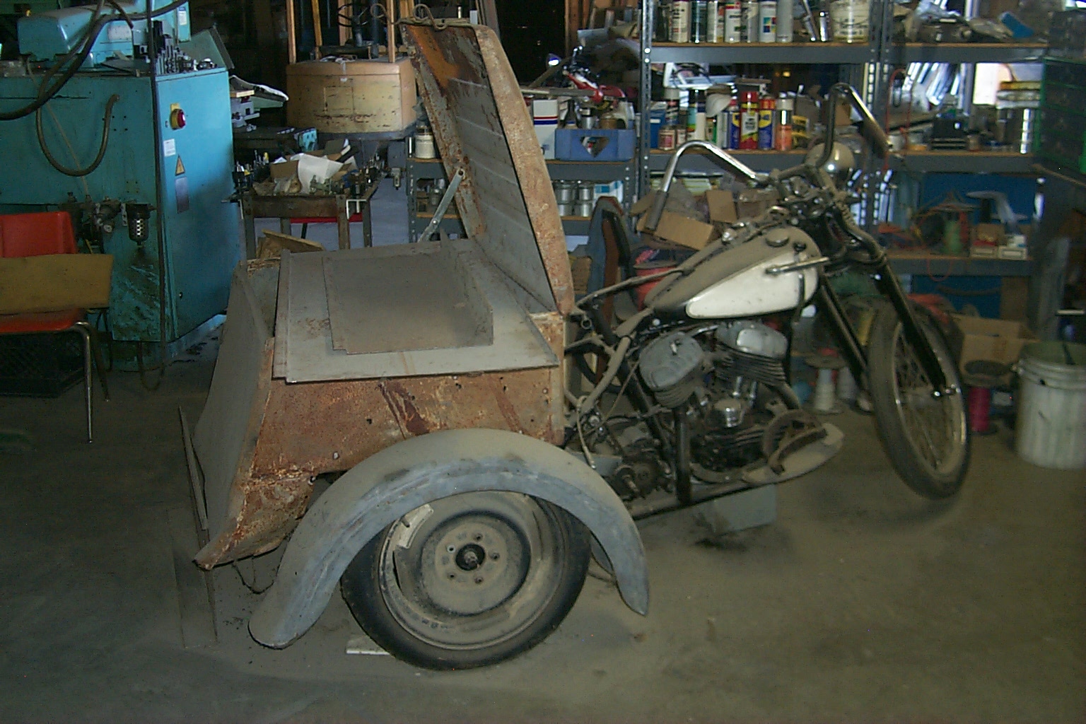 Now for a glider/donor there is a 1958 Harley Davidson Servi-car basket case that has been taking up room in the shop for over fifteen years. Should be light enough, has room for batteries in the rear box, can be converted with either a transmission or not as I determine when I get to it.