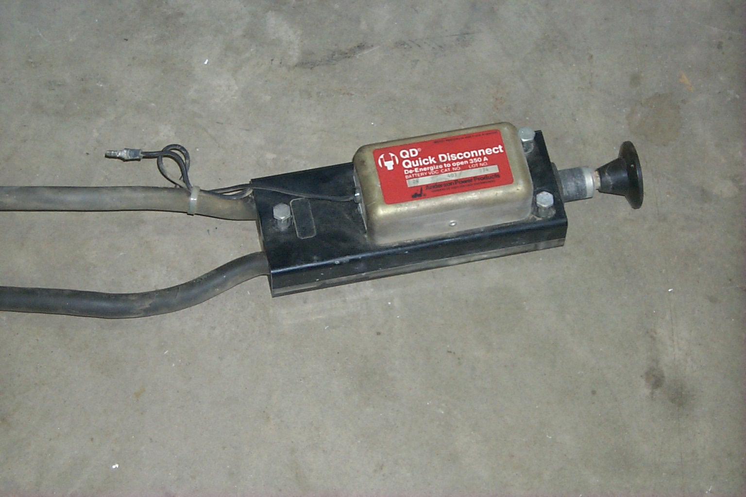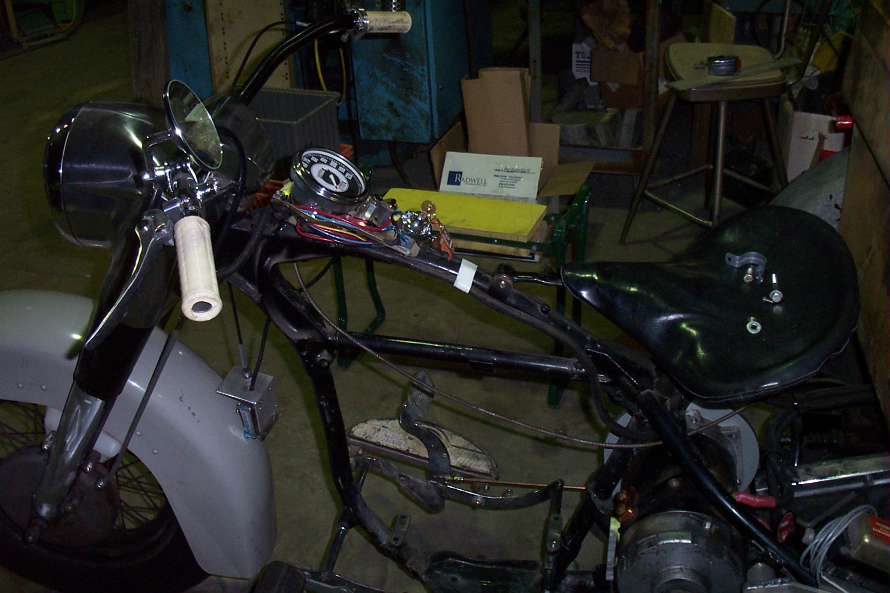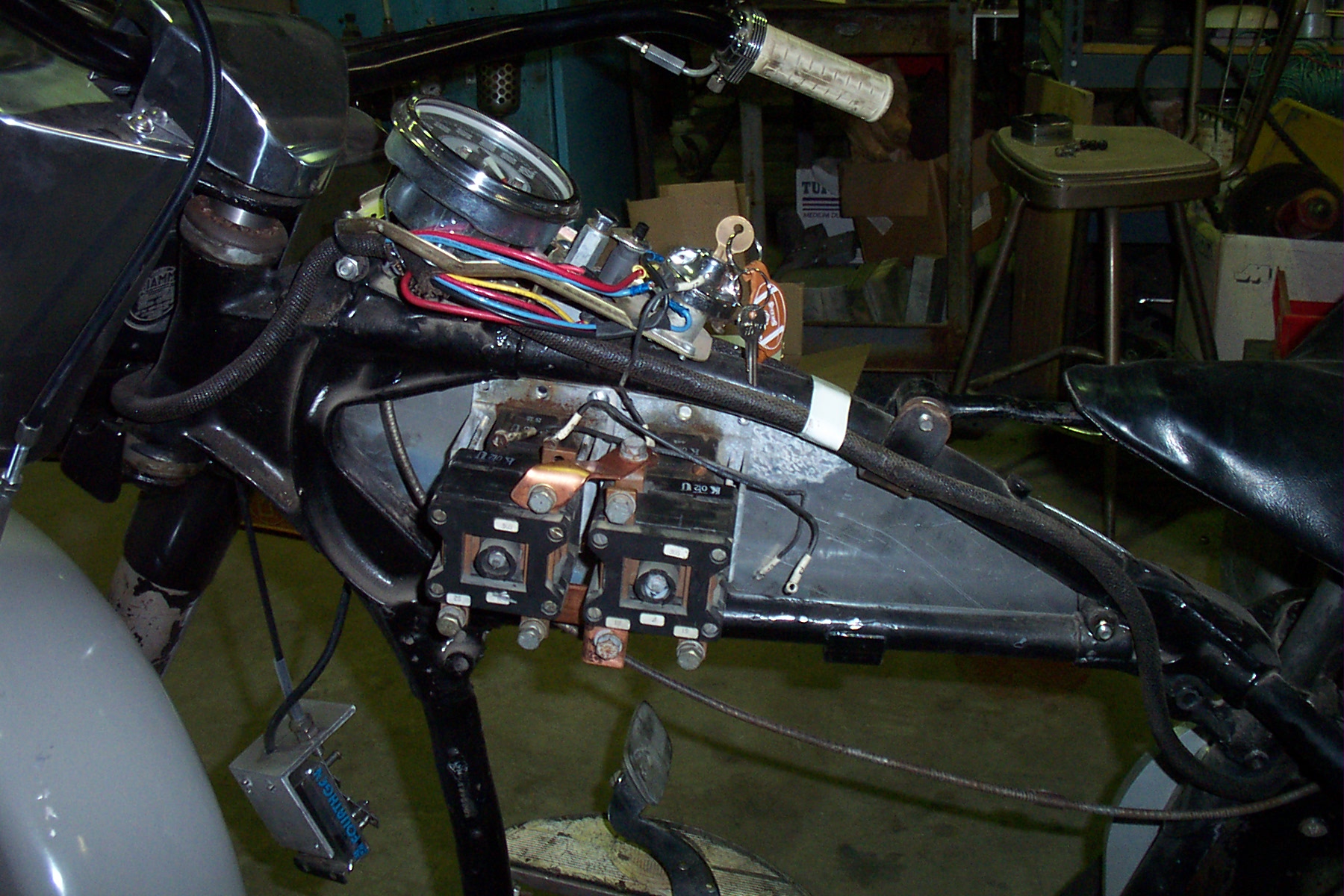 I also retrieved from the pallet picker an emergency kill switch which I am still thinking about where to locate on the bike. The kill switch is remote controlled and rated at 350 amps. Since it was on the pallet picker that the motor came off of it should be capable of killing the motor circuit if required. These are pictures of the emergency "Quick Disconnect". The small wire is the control circuit which must be on for the switch to remain engaged. The black knob on the right must be pushed in manually to reset the switch every time the power is cycled. A slight problem has come up with the power relays that I have been intending to use from the pallet picker as they appear to have 18 volt coils. I have posted a question to the gurus on the EVDL to see what I can do about this little hitch. The call on the EVDL came up with a couple of ideas. First use a simple resistor in series with the coil sized to drop the additional 6 volts. Second build a slightly more complicated circuit with a driver integrated circuit (IC) to power the coil at the required voltage. A new tack and an inspiration have come up with a different relay to use for the power relay which eliminated the need for an 18 volt signal. I remembered the main power relay that used to be on a zoom boom manlift that I had converted to solid state control many years ago. It originally used an aircraft starter relay to switch on and off the motor, but it had been removed when the lift was made electronic with a Curtis controller. Being a packrat, I had saved the removed relay and also the spare relay that I had for the manlift. They are rated at 400A DC on the power pole and 28 volts DC continuous on the coil. On the manlift they had been run on the 24 volt control circuit. A quick test on the bench power supply showed it to work fine on 24 volts. This is the power relay from the manlift. The fuse and buss bar were not a part of the manlift. I located a mounting place next to the speed controller where I can make the connection to the B+ on the controller with a piece of copper buss bar. I was able to mount the power fuse on a pair of insulators commonly called "red apples" in the trade. In my pile of old buss bars from motor control centers I was able to locate a "U" shaped piece that I was able to modify to connect the output of the power fuse to the input of the power relay. This makes a really compact installation for the + side of the power circuit. The left side of the power fuse in the above picture will be cabled to the + side of the battery pack. I was able to use a piece of shrink tube to insulate the bar going from the power relay to the controller. The buss from the fuse to the power relay had to be insulated with tape since it is wider than the largest shrink tube that I have. I used a layer of varnished cambric covered by a double layer of vinyl tape. I have gotten the Emergency Disconnect mounted and begun the wiring. This location will put the operator handle just out from under the front of the back box and under the riders seat. It should be easy to reset when mounting the bike. I intend to mount a maintained position pushbutton on the dash to use as an emergency stop switch as well as having the control through the key switch. Here is the preliminary sketch of the wiring. The system will be very simple with no turn signals or marker lights. Only a head light, tail lights and stop lights. The power wiring is now done and I have moved on to the controls. The wire from the emergency disconnect had a lug already mounted on it and it was long enough to reach to the B- terminal on the controller. I added the shrink tube to keep the exposed metal to a minimum. I don't have large enough shrink tube in any color but red so all the power lugs are insulated red. As shown in the picture, the shrink tube was installed long enough on the leads to the motor to go beyond the B+ power bar just for an added measure of insulation. The wires are also separated by an air gap, but time may allow them to close the gap. All that is left of the power wiring is the batteries and battery interconnects. I need to make a trip to Sacramento tomorrow and may be able to pick up some batteries there. It is probably a little premature, but I want to try the system to see how it will move the bike. The control wiring is begun and the yellow wire shown off the side of the picture above is for the tail lights. With a 24 volt system I am going to install the tail and stop lights in series to allow 12 volt lamps to be used. If I decide to increase the battery voltage to something higher, then I will have to install a DC-DC converter to create the 24 volts for controls and lighting. Above are the first 4 batteries installed in the battery rack as well as a shot of the interconnect. The interconnect is made out of copper buss bar and insulated with shrink tube. All bolts were torqued to the manufacturer's spec of 95-105 inch pounds. June 06; As noted on the drive page, I have removed the transmission and now need to add an electrical reverse. I don't want to destroy the original gas and oil tanks for the bike as they are vintage and in good shape. I did find a set of other tanks that I am planning on cutting the back out of to make a cover for the new electrical reverse.