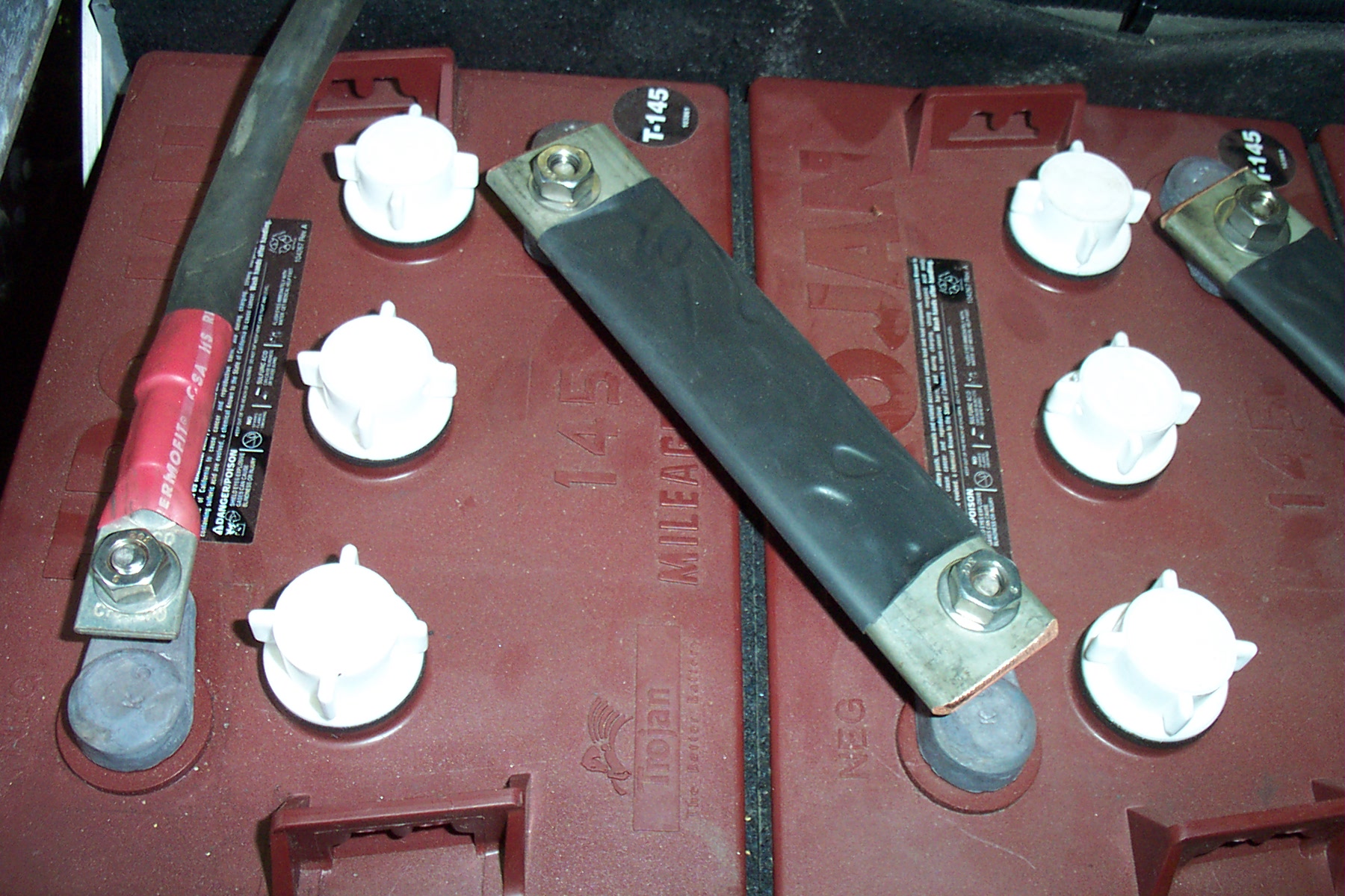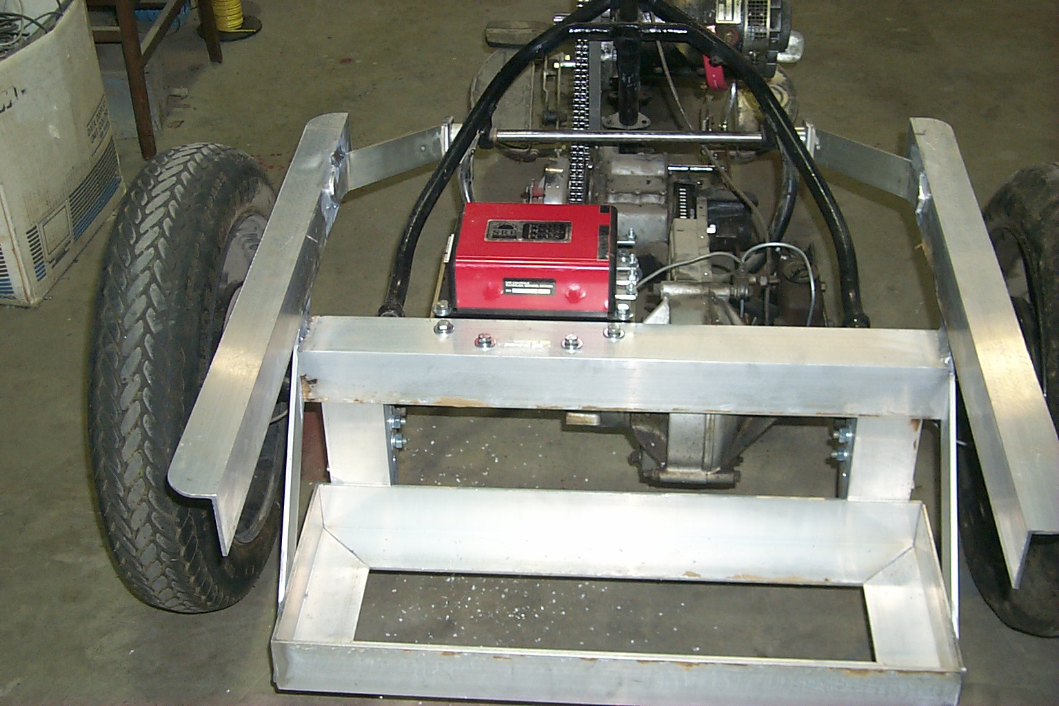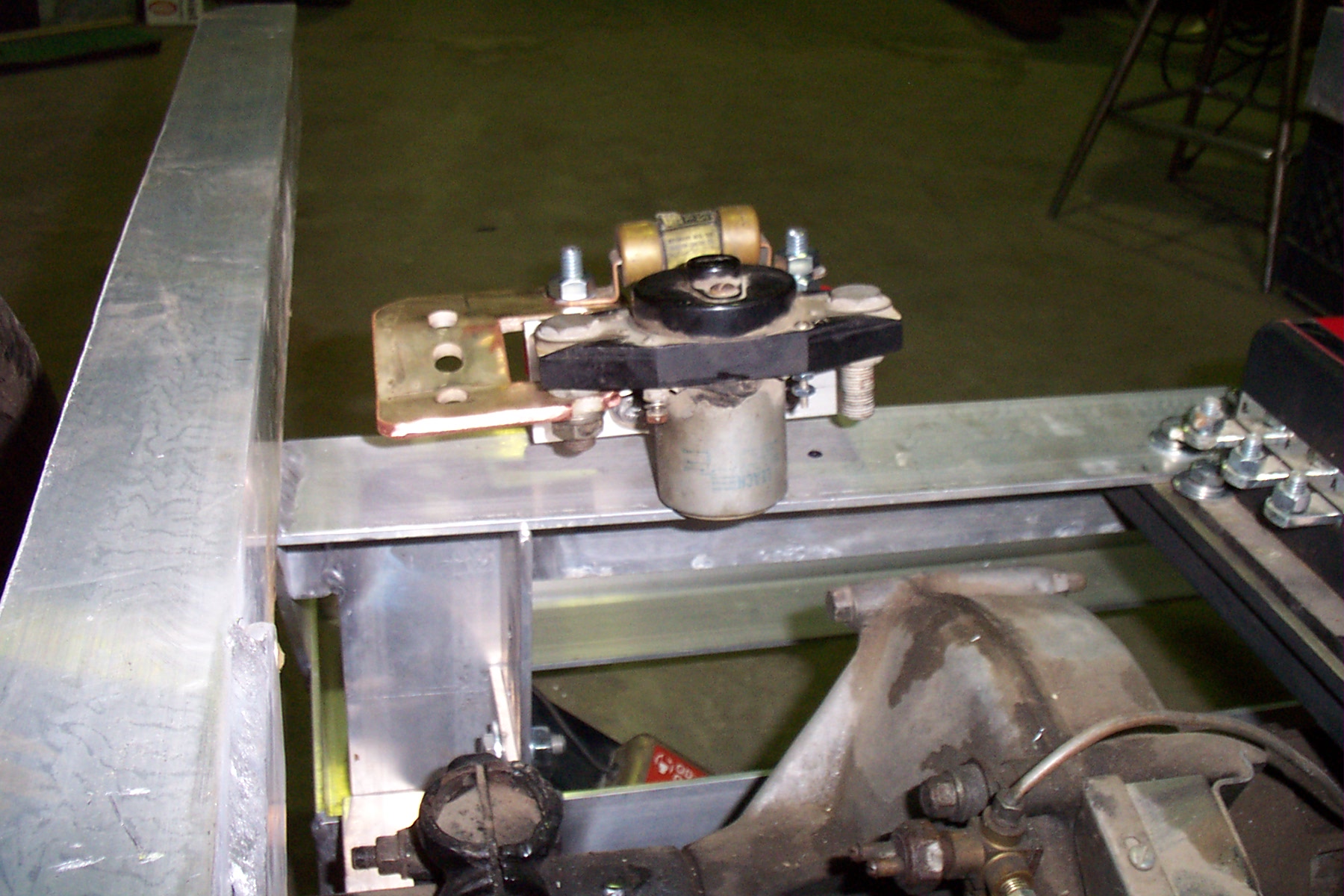 I also retrieved from the pallet picker an emergency kill switch which I am still thinking about where to locate on the bike. The kill switch is remote controlled and rated at 350 amps. Since it was on the pallet picker that the motor came off of it should be capable of killing the motor circuit if required. These are pictures of the emergency "Quick Disconnect". The small wire is the control circuit which must be on for the switch to remain engaged. The black knob on the right must be pushed in manually to reset the switch every time the power is cycled. A slight problem has come up with the power relays that I have been intending to use from the pallet picker as they appear to have 18 volt coils. I have posted a question to the gurus on the EVDL to see what I can do about this little hitch. The call on the EVDL came up with a couple of ideas. First use a simple resistor in series with the coil sized to drop the additional 6 volts. Second build a slightly more complicated circuit with a driver integrated circuit (IC) to power the coil at the required voltage. A new tack and an inspiration have come up with a different relay to use for the power relay which eliminated the need for an 18 volt signal. I remembered the main power relay that used to be on a zoom boom manlift that I had converted to solid state control many years ago. It originally used an aircraft starter relay to switch on and off the motor, but it had been removed when the lift was made electronic with a Curtis controller. Being a packrat, I had saved the removed relay and also the spare relay that I had for the manlift. They are rated at 400A DC on the power pole and 28 volts DC continuous on the coil. On the manlift they had been run on the 24 volt control circuit. A quick test on the bench power supply showed it to work fine on 24 volts. This is the power relay from the manlift. The fuse and buss bar were not a part of the manlift. I located a mounting place next to the speed controller where I can make the connection to the B+ on the controller with a piece of copper buss bar. I was able to mount the power fuse on a pair of insulators commonly called "red apples" in the trade. In my pile of old buss bars from motor control centers I was able to locate a "U" shaped piece that I was able to modify to connect the output of the power fuse to the input of the power relay. This makes a really compact installation for the + side of the power circuit. The left side of the power fuse in the above picture will be cabled to the + side of the battery pack. I was able to use a piece of shrink tube to insulate the bar going from the power relay to the controller. The buss from the fuse to the power relay had to be insulated with tape since it is wider than the largest shrink tube that I have. I used a layer of varnished cambric covered by a double layer of vinyl tape. I have gotten the Emergency Disconnect mounted and begun the wiring. This location will put the operator handle just out from under the front of the back box and under the riders seat. It should be easy to reset when mounting the bike. I intend to mount a maintained position pushbutton on the dash to use as an emergency stop switch as well as having the control through the key switch. Here is the preliminary sketch of the wiring. The system will be very simple with no turn signals or marker lights. Only a head light, tail lights and stop lights. The power wiring is now done and I have moved on to the controls. The wire from the emergency disconnect had a lug already mounted on it and it was long enough to reach to the B- terminal on the controller. I added the shrink tube to keep the exposed metal to a minimum. I don't have large enough shrink tube in any color but red so all the power lugs are insulated red. As shown in the picture, the shrink tube was installed long enough on the leads to the motor to go beyond the B+ power bar just for an added measure of insulation. The wires are also separated by an air gap, but time may allow them to close the gap. All that is left of the power wiring is the batteries and battery interconnects. I need to make a trip to Sacramento tomorrow and may be able to pick up some batteries there. It is probably a little premature, but I want to try the system to see how it will move the bike. The control wiring is begun and the yellow wire shown off the side of the picture above is for the tail lights. With a 24 volt system I am going to install the tail and stop lights in series to allow 12 volt lamps to be used. If I decide to increase the battery voltage to something higher, then I will have to install a DC-DC converter to create the 24 volts for controls and lighting. Above are the first 4 batteries installed in the battery rack as well as a shot of the interconnect. The interconnect is made out of copper buss bar and insulated with shrink tube. All bolts were torqued to the manufacturer's spec of 95-105 inch pounds. June 06; As noted on the drive page, I have removed the transmission and now need to add an electrical reverse. I don't want to destroy the original gas and oil tanks for the bike as they are vintage and in good shape. I did find a set of other tanks that I am planning on cutting the back out of to make a cover for the new electrical reverse.