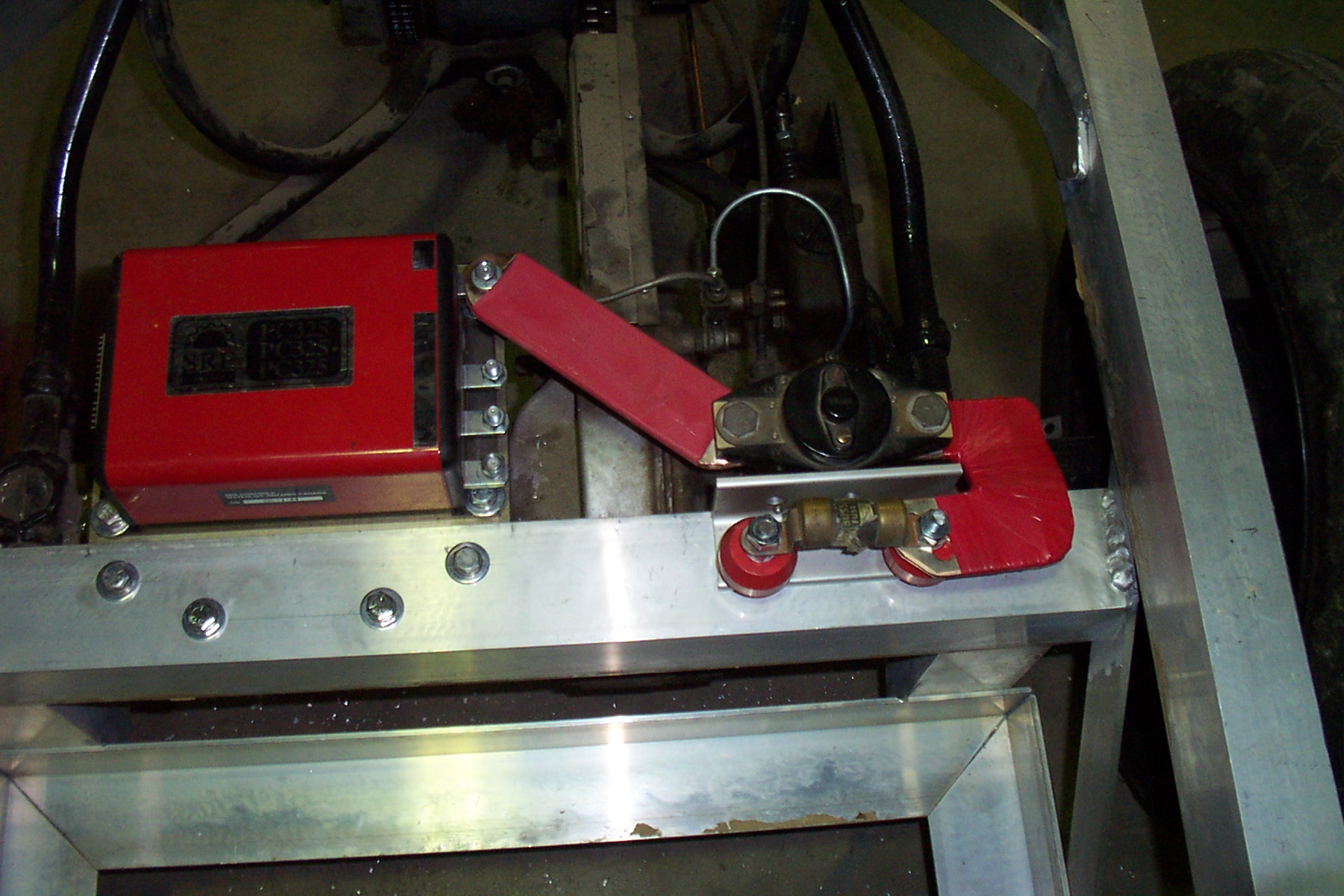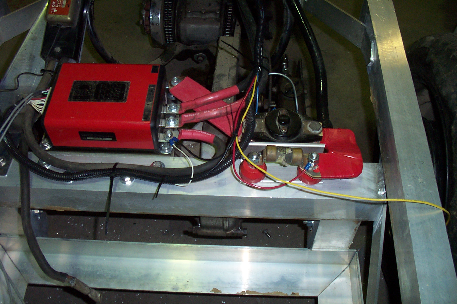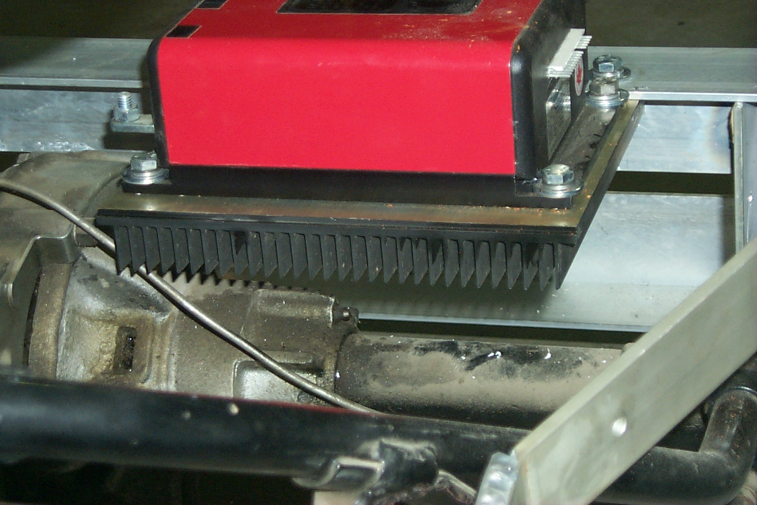 After looking at the bike for a while I think I have located a good place for the speed control to mount which will make a clean project and be out of the way. I am using a SRE PC325 made by Navitas Controls out of Canada. This was purchased for a forklift upgrade that never happened several years ago. It is designed as a pump control for the lift pump on a forklift and is rated at 325 amps continuous and 1000 amps peak. Fortunately, it is set up for a speed pot as well as several set speed inputs. Here it is mounted on a heat sink that I had removed from a military surplus lot of material. This location is below the level of the box "floor" and between the battery rack and the motor.